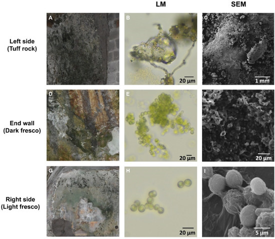 Photographic, light microscopy and scanning electron microscopy (SEM) images of biofilms sampled in the Fornelle cave. (A–C) tuff rock; (D–F) dark fresco; (G–I) light fresco.