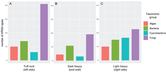 The ARISA analysis revealed that the number of ARISA types (putative different taxa) belonging to each taxonomic group considered was different across the three substrata analysed (Figure 3). The tuff rock substratum was largely dominated by fungi, followed by bacteria and algae in comparable numbers, and less than 10 cyanobacterial types (Figure 3A). The dark fresco community was rich in fungi and bacteria but poor in algae and cyanobacteria (Figure 3B). The light fresco community was the most homogeneous in terms of ARISA types among fungi, bacteria, cyanobacteria and algae, with comparable numbers of types (Figure 3B). Nonetheless, fungi presented the highest number of ARISA types, algae the lowest. In general, the fungal component accounted for the highest number of ARISA types in all substrata, with prevalence on tuff rock (Figure 3A). Cyanobacterial types were higher on dark fresco than on tuff rock and light fresco (Figure 3). Algal and bacterial types showed similar numbers in tuff rock and dark fresco substrata (Figure 3A,B). In general, the results of the ARISA are comparable, in terms of trends of occurrence of algae and cyanobacteria, with the ones obtained with the culture-approach. However, the number of fungal and bacterial taxa is greatly underrepresented in the latter approach, probably because most of the fungi and bacteria cannot be cultured with traditional methods. As a general trend, we observed a reduction in green algal biodiversity from the outermost to the deepest areas of the cave environment.