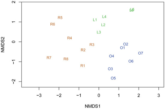 - Oksanen, J.; Guillaume Blanchet, F.; Friendly, M.; Kindt, R.; Legendre, P.; McGlinn, D.; Minchin, P.R.; O’Hara, R.B.; Simpson, G.L.; Solymos, P.; et al. Vegan: Community Ecology Package. R Package Version 2.5-7. 2020. Available online: https://CRAN.R-project.org/package=vegan (accessed on 29 April 2021).