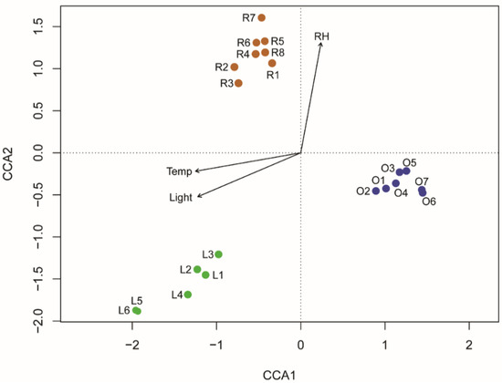 Temperature, light intensity and relative humidity registered at each sampling site were slightly positively correlated with the variance of biofilm community (temperature: r2 = 0.154; light intensity: r2 = 0.162; relative humidity: r2 = 0.165). These correlations were all significant (p < 0.001) and, accordingly, included in CCA analysis. All the environmental parameters had the same weight in the definition of the biofilm community. The CCA showed that the aforementioned environmental parameters explain the 27% of observed variation (inertia). The first axis (CCA1) explained 11.2% of the variation, while the second one (CCA2) 10.5%. Samples of light fresco (L1-L6) are slightly positively correlated with light intensity and temperature, whereas dark fresco samples are negatively correlated with these parameters (Figure 5).
