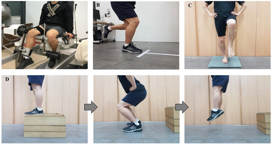Procedure of Lower-Extremity Assessment Protocol. (A) isokinetic and isometric strength assessment of knee joint; (B) functional hopping task; (C) single-leg balance on force plate; (D) Landing Error Scoring System.
