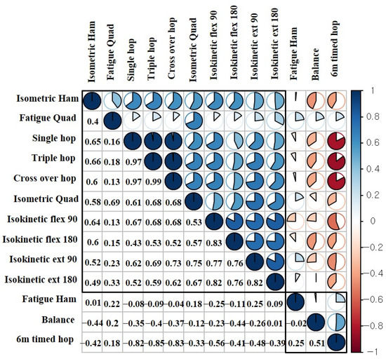 All independent variables of LEAP were analyzed using factor analysis because there were no items that inhibited validity. Therefore, the 14 components of LEAP were the factors analyzed using principal components analysis with Varimax rotation. The factor loadings were all above 0.5, satisfying the validity of the overall LEAP components. The analysis yielded four factors that explained 85.315% of the variance for the entire set of variables (Table 2). The first factor was labeled “functional task” with the following components: the single hop, triple hop, cross-over hop, and 6 m timed hop (explained 30.335 of the variance). The second factor included the most components of the four factors, and it was labeled “muscle strength” with the following components: isokinetic knee flexion strength (90°/s and 180°/s), isokinetic knee extension strength (90°/s and 180°/s), and isometric knee flexion and extension strength (explained 28.492 of the variance). The third derived factor was labeled “neuromuscular control” with the following components: single-leg balance and LESS (explained 14.884 of the variance). The fourth factor was labeled “fatigue index” and included knee flexion fatigue index and knee extension fatigue index (explained 11.604 of the variance). The results of Pearson’s correlation are illustrated as a matrix (Figure 2).