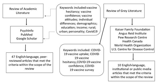 A literature review was conducted using a broad search strategy with the keywords: vaccine hesitancy; vaccine confidence; vaccine attitudes; individual differences; demographics; education; income; rural; urban; personality; COVID-19 and using multiple databases (i.e., PsycInfo, PubMed, Google Scholar). Articles were included if they were published in English, appeared in peer-reviewed journals, and were relevant to the topic of demographic and individual factors associated with vaccine hesitancy. Survey data released by national organizations or published in reputable media outlets were included to supplement the scientific literature. The grey literature search included specific terminology to retrieve the most recent and emerging data: COVID-19 vaccine uptake, COVID-19 vaccine hesitancy, COVID-19 vaccine confidence, and COVID-19 vaccine survey. Articles contained within the review spanned from 2006 to 2021. To be as comprehensive as possible, we included papers that pertained to the interrelated constructs of vaccination uptake, attitudes, and hesitancy/confidence. Please see Figure 1 for a flowchart summarizing the search strategy. Demographic determinants of vaccine hesitancy included age, income, education and health literacy, rurality, and parental status. Individual difference variables included mistrust in authority, disgust sensitivity, and risk aversion. Findings are summarized in Table 1.