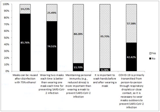 The mean (SD) knowledge score on mask usage was 3.10 (0.94). Most (95.7%) participants agreed that it is important to wash hands before and after wearing masks (Figure 1). Moreover, 85.8% of study participants disagreed that ethanol can decontaminate masks for reuse.