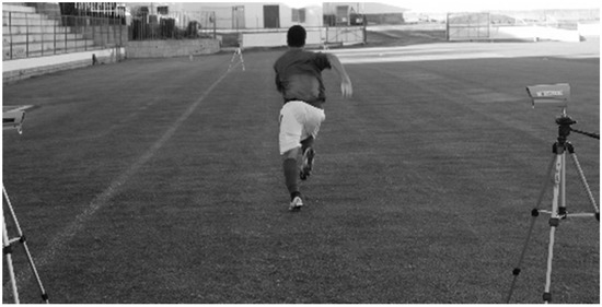 Regarding the tests that concern the anaerobic power of each player, the Running Anaerobic Sprint Test (RAST) was implemented [22,23]. The test consists of running six times the distance of 35 m in the shortest time possible, with a 10-s interval between each repetition; the output always starts in a static position (Figure 1). The time of each run was measured through the device Microgate Timing System—Race time 2. The anaerobic parameters determined were maximum power, minimum power, average power, and fatigue index.