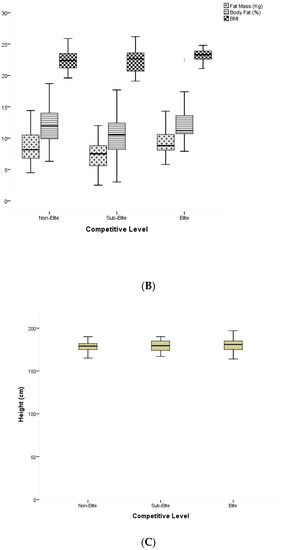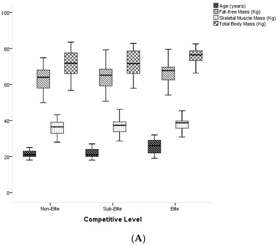 (A)—Comparisons between groups (competitive level) regarding the variables Age, Fat-free Mass, Skeletal Muscle Mass and Total Body Mass; (B)—Comparisons between groups, regarding the variables Fat Mass, Body Fat and BMI; (C)—Comparisons between groups, regarding the variable Height.