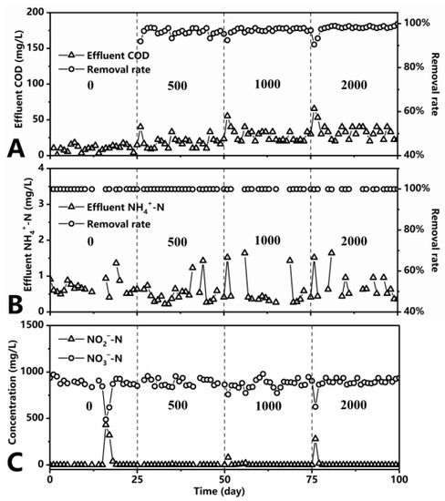 The MBR operation was divided into four stages, each of which ran for 25 days continuously. The effects of 0, 500, 1000, and 2000 mg/L influent COD at each stage successively on the performance of MBR were investigated as influent NH4+-N was maintained at 1000 mg/L. As shown in Figure 1, the effluent COD content of the reactor was relatively low at each stage, although it increased accordingly (ANOVA, p < 0.05, Table 2), providing a satisfactory COD removal rate; this finding might be explained by the fact that the COD in the synthetic wastewater was glucose, which is a biodegradable substance. Greater than 99% of NH4+-N was removed, as the effluent concentration was less than 2 mg/L during the whole period (ANOVA, p > 0.05, Table 2), indicating that different influent COD contents did not affect NH4+-N removal. The effluent NO2–-N concentration was also generally less than 2 mg/L, with the exception of aeration device failures on the 16th and 76th day that led to insufficient DO in the reactor, resulting in a brief accumulation of NO2−-N (ANOVA, p > 0.05, Table 2). The reason for nitrite accumulation was that the Monod saturation constants of oxygen for AOB and NOB are 0.3 and 1.1 mg/L, respectively [43]. These findings indicate that AOB has a stronger affinity for DO, and NOB is initially inhibited when DO is insufficient [44,45,46]. The NO3−-N concentration in the effluent revealed that most of the NH4+-N in the influent was converted into NO3−-N (ANOVA, p > 0.05, Table 2). Thus, the four different C/N ratios had a negligible effect on the treatment efficiency of MBR, which demonstrated excellent performance for the removal of NH4+-N and COD with a high NH4+-N load. The study by Xia et al. [23] also showed that the removal rate of COD and NH4+-N in the reactor changed marginally when the C/N ratio increased from 3 to 5 and 10.