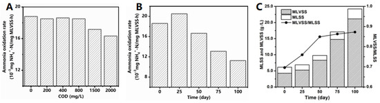 (A) Ammonia oxidation rate of seed sludge under different initial COD concentrations. (B) Ammonia oxidization rate of sludge at different stages. (C) Variation of the sludge concentration in the MBR.