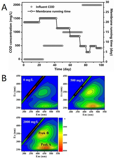 EEM is a fast and sensitive tool, which can provide fingerprint information of fluorescent substances and has been widely used in the characterization of SMP [38,57]. The EEM spectra of SMP in the effluent of MBR are shown in Figure 3B. The two main characteristic peaks of SMP are produced by activated sludge. Peak A (Ex/Em: 260/460–464) and Peak B (Ex/Em: 345–350/426–437) were both attributed to humic acids [38]. Table 3 shows that the intensity of these two characteristic peaks increased as the influent COD content increased. When the influent concentration of COD reached 2000 mg/L, the intensity of the two characteristic peaks was greater than double that of 0 mg/L. It could be concluded that high influent COD stress promoted the production of SMP, consequently accelerating the rate of membrane fouling.