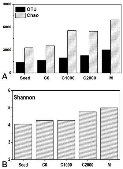 High-throughput sequencing was performed at Zhongyijinda Analytical & Testing Co., Ltd. (Yixing, China) on Illumina Miseq platform. Mothur (http://www.mothur.org/) was applied to select the corresponding sequence with specific barcodes inside each sample. Data denoising was accomplished using bioinformatics software Mothur and Sickle (https://github.com/najoshi/sickle) following the method of a previous study [40]. To compare all the samples at the same sequencing depth, the number of valid sequences was unified by randomly drawing 28,716 reads from the samples after noise reduction. The Ribosomal Database Project (RDP) (http://rdp.cme.msu.edu/) Classifier was responsible for downstream taxonomic assignments with a confidence threshold of 50% [41]. Richness and diversity indices of microorganisms, including operational taxonomic units (OTUs), Chaos index, and Shannon index, were calculated using Mothur [42]. Software Paleontological Statistics (PAST, v.3.01) was used for cluster analysis of the microbial community with an unweighted pair-group average method.