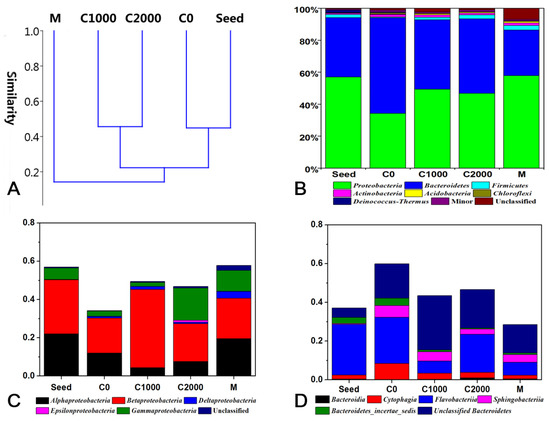 (A) Cluster analysis of microbial community structure. (B) Relative abundance of bacterial phyla. (C) Relative abundance of bacterial classes in Proteobacteria. (D) Relative abundance of bacterial classes in Bacteroidetes.