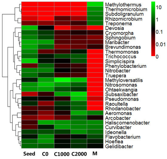 The differences in microbial communities in different samples were characterized using cluster analysis. Figure 5A demonstrates that the microbial community structure of the seed sludge was similar to that of sample C0. In addition, sample C1000 was similar to C2000, and that of the filter cake layer sample M was the most different from the other samples. The seed sludge came from a high NH4+-N loading reactor with a relatively low C/N ratio (0.36); therefore, it was similar to sample C0. Samples C1000 and C2000 were similar sludge samples with high C/N ratios. Ecological conditions, such as the DO of microbes in the cake layer, were quite different from those of the reactor mixture; thus, the community structure of sample M was separated from that of the other sludge samples.