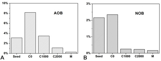 Figure 7A shows the relative abundances of AOB in the samples. The proportion of AOB in seed sludge was 3.11% and increased to 8.17% in the sludge sample with an influent COD of 0 mg/L. An environment with a low COD concentration was beneficial to the growth of AOB as autotrophs, leading to its enrichment in the C0 sample. As the influent COD content increased, the proliferation of heterotrophs inhibited AOB, resulting in a gradual reduction in the relative abundance of AOB in the C1000 and C2000 samples, accounting for only 3.48 and 1.10% of the total bacteria, respectively, which declined by 57.53 and 86.54% compared with the C0 sample, respectively. (The percentage of abundance difference was calculated by dividing the abundance difference between the C1000 or C2000 and C0 samples by the abundance in the C0 sample, which is the same below.) These findings were consistent with the results of Xia et al. [23]. The AOB exhibited the lowest abundance in the cake layer of the membrane module, accounting for only 0.26% of the bacteria. This finding might be attributed to the fact that the DO in the cake layer was reduced compared with that in the mixture, which was not conducive to the growth of aerobic bacteria, such as AOB. The abundance of NOB in each sample was similar to that of AOB (Figure 7B). Specifically, the abundance increased in the C0 sample, diminished significantly in the C1000 and C2000 samples, and reached the lowest in the cake layer. Similar to AOB, NOB are autotrophic bacteria that are also inhibited by the competition of heterotrophs in the process of COD promotion, causing a gradual reduction in the proportion of bacteria. The abundance of NOB in the C1000 and C2000 samples decreased by 89.32 and 90.17%, respectively, compared with the C0 sample.
