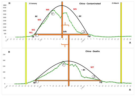 The contaminated people and deaths due to COVID-19 in China. Note. M1, match 1; M2, match 2; M3, match 3; M4, match 4; M5, match 5; M7, match 7; Id, initial date; Fd, final date; ac, acceleration; -ac, deceleration; H, height; A, amplitude; ∆dc, period between the deaths and contaminated peaks of the ideal curve.