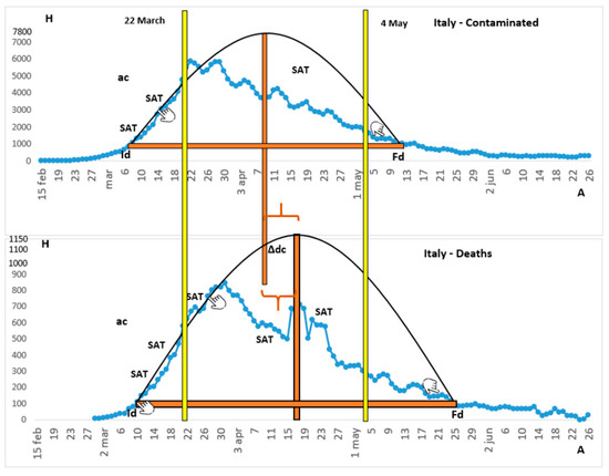 The contaminated people and deaths due to COVID-19 in Italy. Note. Id, initial date; Fd, final date; SAT, saturation point; ac, acceleration; -ac, deceleration; H, height; A, amplitude: ∆dc, period between the deaths and contaminated peaks of the ideal curve.