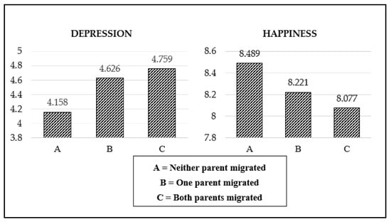 Figure 1, children with one and especially two migrant parents had more severe depression and lower subjective happiness.