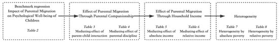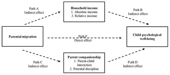 First, we use an ordered probit model to identify the causal relationship between parental migration and the psychological well-being of children. Second, we examine the two ways (parental companionship and household income) that parental migration affects the psychological well-being of children using four variables, namely parent–child interactions, parental discipline, absolute and relative incomes in the previous year, based on the mediation model [