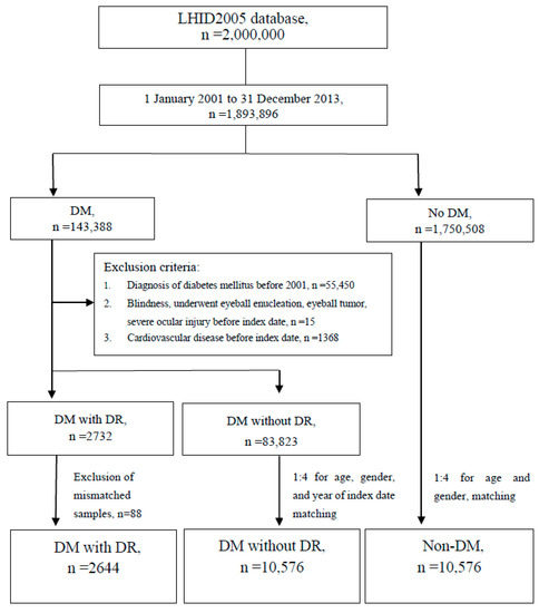 From 1 January 2001 to 31 December 2013, there were 143,388 people with a diagnosis of DM and 1,750,508 people without DM. Among the patients with DM, those who were diagnosed with DM before 2001, blind, underwent an eyeball enucleation, had an eyeball tumor and had a severe ocular injury before being diagnosed with DM were excluded. This resulted in a total of 86,555 people with DM to be analyzed. Among these patients, 2732 were diagnosed with DR and 83,823 patients without DR. Among the patients with DR, 1326 were diagnosed with NPDR and 1318 were diagnosed with PDR. The study population was classified into three groups for comparison: DM with DR, DM without DR and Non-DM. After the exclusion of mismatched samples, there were 2644 patients in the group of DM with DR. Through pair matching on age, gender and year of index date at a ratio of 1:4, there were 10,576 people in the group of DM without DR. Through pair matching on age and gender at a ratio of 1:4, there were 10,576 people in the group of Non-DM. The three groups were investigated for the diagnosis of newly occurred cardiovascular events during the study period. The study protocol is shown in Figure 1.