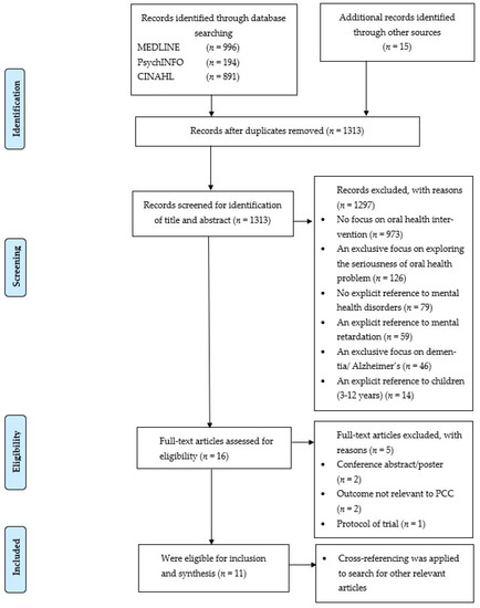 - Adams, C.E.; Wells, N.C.; Clifton, A.; Jones, H.; Simpson, J.; Tosh, G.; Callaghan, P.; Liddle, P.; Guo, B.; Furtado, V.; et al. Monitoring Oral Health of People in Early Intervention for Psychosis (EIP) Teams: The Extended Three Shires Randomised Trial. Int. J. Nurs. Stud. 2018, 77, 106–114. [Google Scholar] [CrossRef]