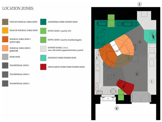 Each video recording was first coded to mark different surgery phases (preoperative, intra-operative and post-operative) such that the duration of each phase could be obtained and the analysis could focus on activities within that phase. This study focuses on the intraoperative phase which was defined as the duration between the incision to the surgical site of the patient and the closure of the surgical site. The plan of the operating room was drawn to demarcate different functional zones, which were bounded and defined according to the type of function conducted in them [17]. The location of surgical team members at every point during the surgery was coded by marking the zone where they were located. Zones included the surgical table (head, foot, right of patient, left of patient), workstation, support, supply and door zones. Transition zones connect the functional zones and were primarily used for circulation within the OR (Figure 2). The head of the surgical table zone was only visible when the surgical table was rotated away from the anesthesia zone. All ORs observed as part of this study included all the functional and transitional zones. However, the ORs varied slightly in terms of sizes and the physical location of the zones within the OR and the size of zones (Figure 3).