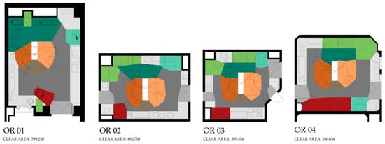 Floor plans of the four ORs observed with zones demarcated (refer to Figure 2 for legend). All floor plans are shown with surgical tables in orientation B.