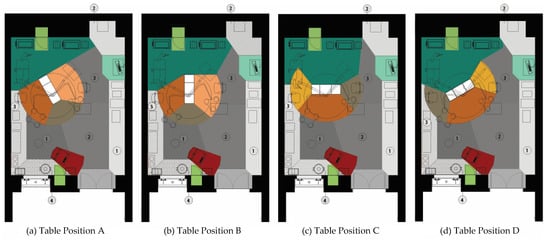 The four different surgical table orientations observed in the ORs in this study (a) Table position A, (b) Table position B, (c) Table position C, and (d) Table position D. These figures show the different surgical table orientations in OR 1. Refer to Figure 2 for legend.
