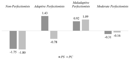 The purpose of this study is to examine the association between perfectionism and participation motives (weight and body image, fun and well-being, prevention and positive health, competition, affiliation, muscle strength and endurance, social recognition, stress control, agility and flexibility, challenge, and health emergencies) and barriers to exercising (body image/physical and social anxiety, fatigue/laziness, obligations/lack of time, and environment/facilities) from a person-oriented approach. Specifically, we will analyze whether the participation motives and barriers to exercising may differ among four perfectionism profiles previously identified by Vicent et al. [33] using latent profile analysis: Non-Perfectionists (low PS and PC), Adaptive Perfectionists (high PS and low PC), Maladaptive Perfectionists (high PS and PC), and Moderate Perfectionists (moderate PS and PC). Figure 1 shows the standardized averages on PS and PC of the four-class solution established by Vicent et al. [33]. Moderate Perfectionists were classified as 68% of the participants, followed by Maladaptive Perfectionists (21%), whereas Adaptive (6%) and Non-Perfectionists (5%) represented, respectively, 6% and 5% of the sample. This four-class solution was the most optimal model in terms of the data fit, classificatory utility, and interpretability (see [33], for a more detailed explanation of the analysis performed).