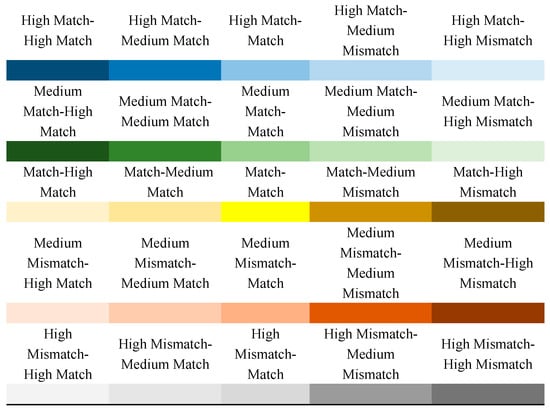 - Cities mismatched in amount but matched in type (Figure 6)—‘medium mismatch, match’ in RS, ‘medium mismatch, medium match’ in PS, i.e., cities with a total imbalance in ES but matches in multiple types of ES—should focus on demand control strategies for specific ES.