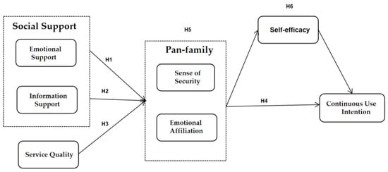 Emotional support, information support, and service quality on health-related social media, mainly provide young adults with a service environment. In this environment, young adults can better seek help and support. Therefore, its impact on young adults’ continuous use of health-related social media is an indirect process. Moreover, China is a society with family as the link, the most important thing for people is family consciousness, and they often restrict their behavior by family social norms; therefore, when young adults are active on the health-related social media, they will also develop a sense of family for the health-related social media. Zhao [33] thinks that this special feeling for a family is “pan-family consciousness”, which will make them feel that they are part of the health-related social media, and they will participate in the activities of the health-related social media more actively, so as to make the use behavior more lasting. Moreover, emotional support, information support, and service quality all positively affect young adults’ pan-family consciousness. The pan-home consciousness is positively correlated with the continuous use intention of health-related social media. Therefore, this paper believes that emotional support, information support, and service quality will have a significant impact on the continuous use intention of health-related social media, through pan-family consciousness. Therefore, this paper assumes the following: