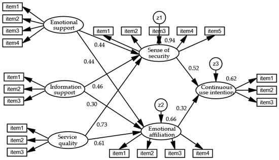 Validity refers to the consistency between the test score and the expected score. In other words, it indicates whether the test score can reflect the characteristics it wants to measure. This paper selected common validity tests, namely, the Kaiser–Meyer–Olkin (KMO) value and the Bartlett sphere test. From the data, we can see that the KMO values of social support, service quality, pan-family consciousness, self-efficacy, and continuous use intention of health-related social media are 0.890 (>0.60), 0.700 (>0.60), 0.928 (>0.60), 0.794 (>0.60), and 0.698 (>0.60), respectively. Moreover, the p-value of the significance coefficient of the Bartlett sphere test of these scales is less than 0.001. Therefore, the scale passed the KMO value and Bartlett sphere tests, indicating that the validity of the structure of the scale is good. In addition, the most of standard factor loading is above 0.7, AVE value is more than 0.5, indicating that the scale has good validity. In terms of discriminant validity, if the correlation coefficient between latent variables is less than the square of AVE, it shows that the latent variables can be distinguished, as can be observed from Table 3, and if the correlation coefficient between variables is less than square of AVE, it shows that all variables have good discriminant validity, and it has passed the validity test.