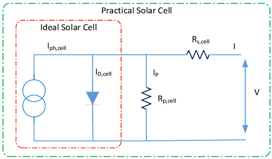Figure 2 shows a single photovoltaic cell diode system based upon which current source, diode, resistance series, and parallel resistance are represented. In the Figure 3 Illustration, the photovoltaic cell current-voltage characteristics are described in the mathematical equation standard [44]: