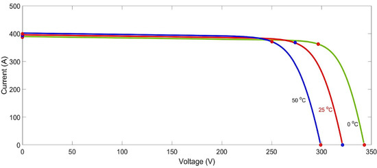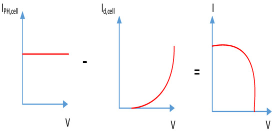 where: is a thermal voltage, is a photocurrent (A), is a series resistance, is a reverse leakage current, is a parallel resistance. The Equation (2) produces voltage and current curve as indicated in Figure 4.