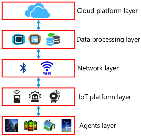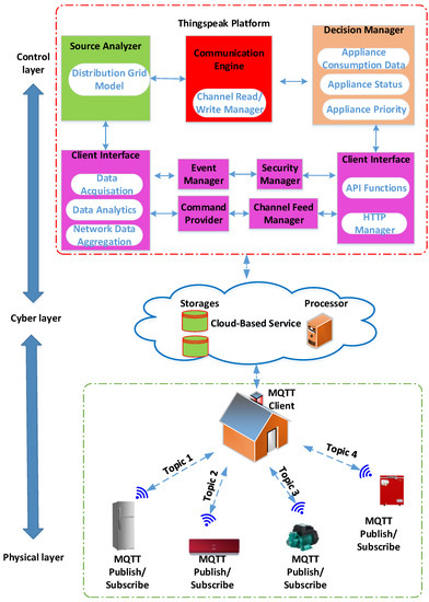 The decentralised controller of a smart MG helps in managing the system operating conditions if there is some disturbance. Furthermore, the IoT technology can be used for communicating between the appliances present in smart homes, central controller, or power management centres. The researchers proposed the IoT platform for collecting the data, monitoring, managing, and controlling a smart microgrid. All appliances and energy resources were integrated and connected in this platform. The major IoT platform layers included energy supply layer, network layer, energy management layer, energy appliance layer, control system layer, and the Internet of Things service layer, as presented in Figure 8.