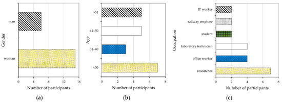 The study was performed on a group of 21 volunteers. Before the tests, subjects filled out a short questionnaire about gender, age, occupation, and health status. In addition, they were asked not to eat or drink in the half hour directly preceding the planned tests. The characteristics of the study group are shown in Figure 1.
