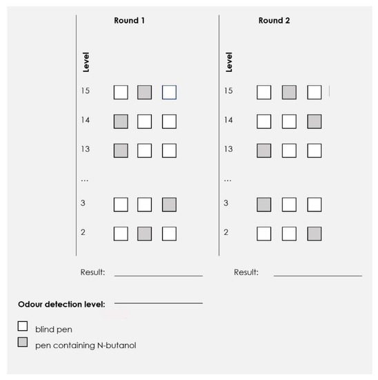 Following the warm-up round, the test included two subsequent rounds separated by a 5-min break. In each round, the pens were presented for 3 s at a distance of 1 cm from each of the nostrils of the blindfolded participant in decreasing dilution order. Thus, three pens were presented at each dilution level—two blank ones and one containing n-butanol. The order of pen presentation was determined by one of the three randomly selected results sheets provided along with the test kit [42].