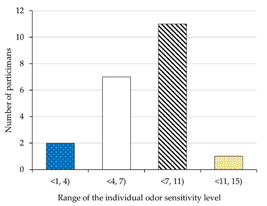 The results of published clinical trials on 1036 subjects [47] and the studies of 39 odor inspectors from six Regional Offices of the U.S. Regulation Enforcement Agency [48] show that for all populations studied, the 8th dilution level usually constitutes the 50th percentile of a study population, while levels 3 and 13 are the lower and upper 5th percentiles, respectively. These values constitute normative values for the general population and can indicate performance criteria for odor inspection staff. These are also very close to the values we obtained. Since the score of 0 to 4 is regarded as an indicator of abnormal olfactory function, which in this case can be associated with recent or ongoing viral infection [47], we decided to exclude two participants whose individual levels of olfactory sensitivity fell into the lower 5th percentile of the studied population.