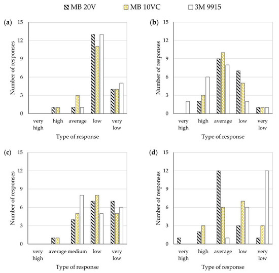 The final stage of the evaluation included filling out the questionnaire, which set out what factors affect odor reduction efficiency and how the participants perceive this for a given type of FFR. The questionnaire was composed of four questions regarding the leak-tightness of the facepiece, donning and fitting difficulty, and subjective perceptions of odor reduction (subjective odor reduction efficiency). The answers were ranked using a five-level Linkert’s scale (very high, high, average, low, and very low; if the leak-tightness was assessed as very high, it meant that the panelists considered the fit of the facepiece to their face as very good; if it was assessed as very low, it meant that the fit was considered as very poor) [46]. Additional questions included whether the head harness elastic band snapped or the FFR slipped during the test and whether there was any pungent or unpleasant odor emitted by the FFR itself (evaluation on a yes/no scale).