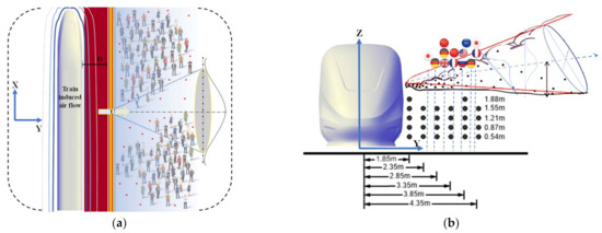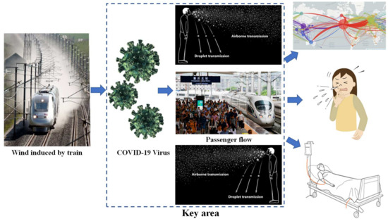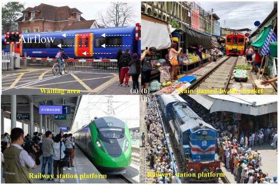 Railway transportation is a relatively economical, convenient, and safe way to travel, and is the busiest form of transportation, carrying millions of passengers each day, especially in China, Japan, Europe, and India [9]. A high-speed train is a standard traffic tool that needs to meet the requirement of transport services, which is inextricably linked to people’s lives as the number of passengers has grown and become much closer both in intra-regional and inter-regional economy and trade. In this case, sudden, massive, and dispersive human migration can extend localized onsets of disease into extensive epidemics [10]. The railway station, where crowds congregate, may become a place similar to a virus petri dish when a quarantinable infectious disease is prevalent, as shown in Figure 1. It is important to notice that the infective dose needed to become diseased with COVID-19 is still unknown so far. The study in [11] showed that crowd density and wind have a strong influence on spreading the virus spread. The relationship between wind speed and the virus spread were totally mediated by the crowd density [12]. Furthermore, infants, young children, and immunocompromised people may be infectious for even longer as differences exist in infectious SARS-CoV-2 between individuals. According to a recent study from [13], an immunocompromised patient infected with SARS-CoV-2 for at least 105 days (no symptoms) and at least 70 days of detoxification was potentially infectious. Therefore, in this situation, the glaring issue here is the effect of train-induced wind on the virus transmission from the possible infected individual, as shown in Figure 1.