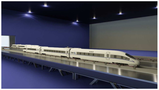 The moving model experiment was performed in the National Engineering Laboratory for High-speed Railway Construction of Central South University [49]. The moving model test rig has a 34 m long track across a test section. As shown in Figure 2, the acceleration and deceleration parts are on both sides, and the available test part is 12 m long across the test section. A 1/16.8 scaled model of a CRH—a high-speed train in operation throughout China—was used in the present experiment.