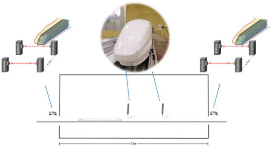 As shown in Figure 3, the length to height ratio L/H of the tested train model is 7.12, where L is the model length of 1.616 m. The L/H of the present tested model was smaller than that of a real train consisting of multiple carriages, limiting the boundary layer’s development along the train, but the whole variant trend is reserved. Furthermore, [48] pointed out that a small Reynolds number in the experiment can compensate for a reduced L/H effect. Thus, the effects of L/H were not considered in the present experiment. The reduced L/H has the potential to be offset by the reduced Reynolds number of the scaled model compared to full scale, as boundary layer thickness is inversely proportional to Reynolds number. In the experiment process, two pairs of photoelectric gates were installed at the test section entrance and exit to determine the model speed. Two Cobra probes measured the train-induced wind in the middle of the test section.