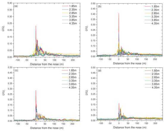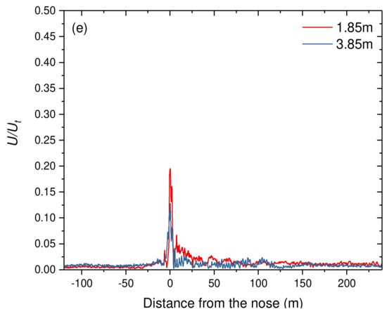 Insight into the distance from the train, all measuring positions, a sharp peak of the wind can be found near the train’s head. After that, velocity reduces sharply and then is followed by a larger crest towards the tail end. The distribution of wind speed was more complicated at the lower height relative to higher heights. This observation is expected because of the complex geometry and the connection mode of wheel-rail contact under the train model as well as the track and surface. Similarly, the distribution of wind is much more complex closer to the train. In general, the wind speed decreases with increasing distance to the train, and the highest peaks are found near the track, where the flow is most influenced by the unshielded wheelsets [54].