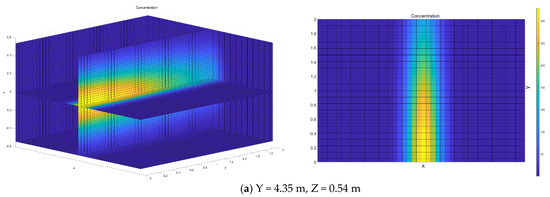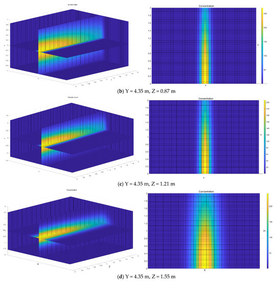 Figure 7 shows the effect of varying the wind speed induced by the train on the side where people are standing (Y = 4.35 m, Z = 0.54 m, 0.87 m, 1.21 m, 1.55 m; Y = 3.85 m, Z = 1.88 m) on viral concentrations. The aerosol evolution concentrations show a fast movement of the puff defined by contour plot lines. The contour plot indicates certain concentration levels. Overall, it was found that the aerosol particles concentration field forms a narrow puff from the patient towards downwind; aerosol particles were carried out with the flow and spread from the source in all directions. An open space geometry modeled with measured wind speed from experiments shows that small particles travel considerable distances, greater than 2 m. Note the strong peak at approximately X = 0, which occurs well after the train passes the receptor at t = 1 s. Qualitatively, these results are expected: the higher the wind speed, the more rapid the Y directional diffusion, so the virus will be pushed to the margins. As shown in Figure 7d, the range of horizontal diffusion is greater than that of others at a relatively low-speed point. It is noticeable that halving the wind speed from 6.24 to 2.87 m/s does not produce a doubling of concentration on the edge. This demonstrates the non-linearity inherent in the model and the nature of turbulent winds. In addition, due to the different rotational speed of the vortex, the flushing of the virus consequently varies from point to point. Even worse, 2 m social distance has apparently failed to protect the passengers for their health. The case modeled in this work is an idealized scenario and does not take into account local infrastructures such as complex terrain and buildings. Local infrastructure is likely to reduce wind speeds and create complex airflow conditions around terrain or buildings in the puff pathway. The terrain and building wake effect could generate huge turbulence and result in more deposits.