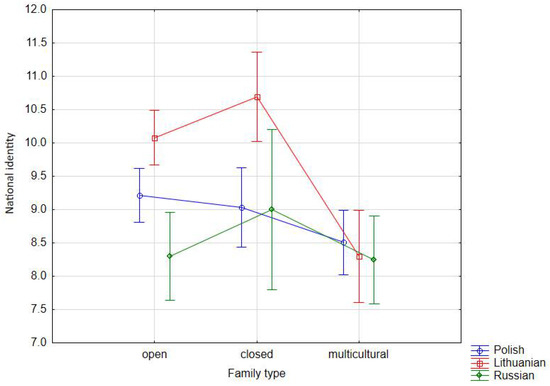 We have observed the first interaction strategy by correlating the variables of nationality and family cultural type. The strategy has focused on the issue of the respondents’ national identification and proved to be a clear strategy as its relevance has been evidenced by already conducted studies on multicultural communities [44,45,46,47]. In the case of Lithuanians (Table 1, Figure 1), their national identification was primarily determined by living in the culturally closed family type ( = 10.69), followed by the culturally open family type ( = 10.08) and, to a lesser extent, the multicultural family type ( = 8.30).