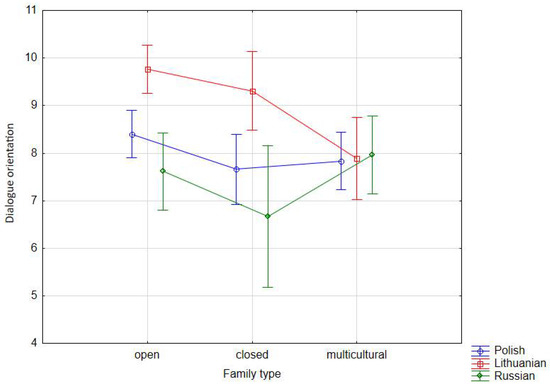 When correlating the leading variables (nationality, family cultural type) with the additional variables, the dialogue orientation variable has become the most prominent (the others have been statistically insignificant). A strategy of building interactions by adolescents, based on a dialogue between nationally and culturally diverse groups, has therefore emerged. We emphasize that, statistically, the adolescents’ orientation towards dialogue in a diverse environment still correlated strongly with the cultural type of the family (mean considered only at the level of statistical significance at p = 0.027 to p = 0.029). Therefore, the conditions of the family of origin, and thus the socialization of generations into the community, potentially plays an important role for describing QoL. The formation of dialogue-based interaction strategies was strongest in the culturally open ( = 8.59) and multicultural ( = 7.90) families. Although somewhat surprisingly, families of the culturally closed type are only slightly less likely to form this orientation ( = 7.88). The general trend allows to put forward a thesis that the dialogue strategy is not only part of the family culture, but rather an environmental requirement. Generational relationships enforce its existence as an important social resource, an important potential for activity in the local environment to which family systems are subordinated. This is also shown by the data generated for each national group. For Lithuanian families (Table 2), the dialogue orientation strategy is the domain of the culturally open families ( = 9.77) and slightly less of the culturally closed ( = 9.31) families. Surprisingly, the lowest occurrence of dialogue orientation is in families of the multicultural type ( = 7.89). In Polish adolescents, the dialogue interaction strategy is present in the culturally open families ( = 8.40), followed by the multicultural families ( = 7.84), and of the culturally closed type ( = 7.66), which could be modeled as an effect of the defined socialization. In the group of Russian adolescents, the dialogue strategy in building social interactions was associated with socialization in multicultural ( = 7.97) and culturally open ( = 7.61) families (Table 2, Figure 2).