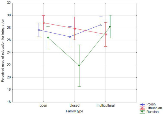 In Polish and Russian families, these dominations are similar. Families of the multicultural and culturally open type attribute the highest importance to the need of upbringing for integration. Surprisingly, this direction of upbringing is also (although actually at a lower level) in families of the culturally closed type, maintaining a statistically significant trend. On the other hand, in the case of Lithuanian families, ascribing importance to the need of upbringing to the community occurs primarily in families of the culturally open type, less so in the culturally closed type and least in the multicultural type. Taking into account the statistical means, the greatest importance to upbringing for social community is attached by families of the culturally open type in the case of Lithuanian families of respondents ( = 28.81), of the multicultural type in the case of Polish families ( = 28.49), and of the multicultural type in Russian families ( = 28.20) (Table 3, Figure 3).