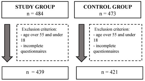 Minors and persons over 55 were excluded from the study. Women with concomitant diseases, such as rheumatoid diseases, hypertension, atherosclerosis, diabetes, infertility, epilepsy, and gynaecological problems, treatment of which could have an impact on the assessment of functioning and quality of life, could not take part in the study. Persons who did not reply to all of the questions included in the questionnaires were also excluded. Only complete questionnaires were used in the analysis. All questionable data were discarded. Ultimately, taking into account all of the inclusion and exclusion criteria, 439 women qualified for group B, and 421 for group C (Figure 1). Group B was recruited through internet forums associating women with endometriosis. Group C was gathered via publicly available social networks. The study collected demographic data and data on risk factors and the course of the disease, such as: age, education, the occurrence of addictive behaviours (smoking and drinking alcohol), the course of the menstrual cycle, multiple pregnancies, and the occurrence of miscarriage. Women diagnosed with endometriosis were additionally assessed in terms of the location of the foci and the presence of accompanying symptoms. The above variables were treated only as information concerning the group characteristics and they were not taken into account in further analyses.