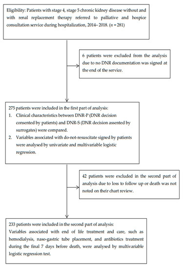 This retrospective study was conducted at a tertiary teaching hospital in Taiwan, and the diagram of two-stage patient selection is shown in Figure 1. Patients were selected using the following inclusion criteria: (i) receiving palliative and hospice care consultation service between January 2014 and December 2018, (ii) diagnosis of CKD stage 4 (estimated glomerular filtration rate (eGFR): 15–30 mL/min/1.73 m2), CKD stage 5 (eGFR less than 15 mL/min/1.73 m2 and not receiving renal replacement therapy) CKD, and stage 5 CKD with renal replacement therapy) before study enrollment, and (iii) age ≥20 years. We excluded those patients who did not have any DNR documentation signed by either by themselves or their surrogate decision-makers after palliative care consultation service. For the second part of the analysis, we excluded those who lost to follow-up or their death was not identified. This study protocol was approved by the Institutional Review Board of Kaohsiung Medical University Chung-Ho Memorial Hospital (KMUHIRB-E(II)-20200220).
