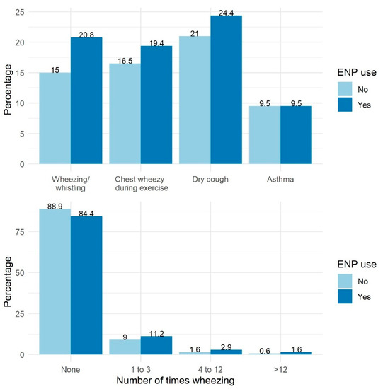The percentage of subjects who experienced respiratory outcomes with and without ENP use are noted in Figure 1. In unadjusted (univariable) models (Table 2), using ENP in the past 12 months was associated with a higher likelihood of experiencing all considered respiratory outcomes (wheezing/whistling, number times wheezing, dry cough at night, and chest sounding wheezy during or after exercise) in the past 12 months (p < 0.05), except being told by a health professional that they had asthma (p = 0.95).
