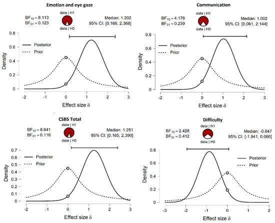 With regard to Figure 1, the pizza plot distribution shows the proportion of evidence for the H1 (red) and H0 (white) hypothesis, being higher for these four cases but not for the other variables. Moreover, the dashed line shows the prior distribution, while the solid line the posterior distribution based on the current data. As described in previous literature [55], the posterior distribution is shifted to the right over positive effect sizes, as depicted for Emotion and Eye Gaze, as well as Communication. The other way around occurs for Difficulty. It should be noted that each distribution has a grey dot at the 0.0 effect size (δ), showing whether the dot on the prior distribution is higher than the one on the posterior distribution. Therefore, the Bayes factor supports the alternative hypothesis in this direction.