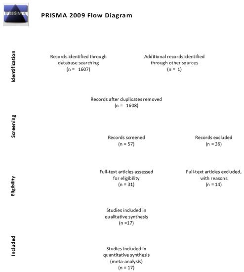 From the 57 articles, 17 were finally included in the meta-analysis. Fifteen studies were identified by both reviewers and two additional ones by reviewer 2 (HS). The inter-evaluation similarity was 88%. Details about the search synthesis are presented in Figure 1 [19]. We detail the papers contained in the meta-analysis in Table 1.